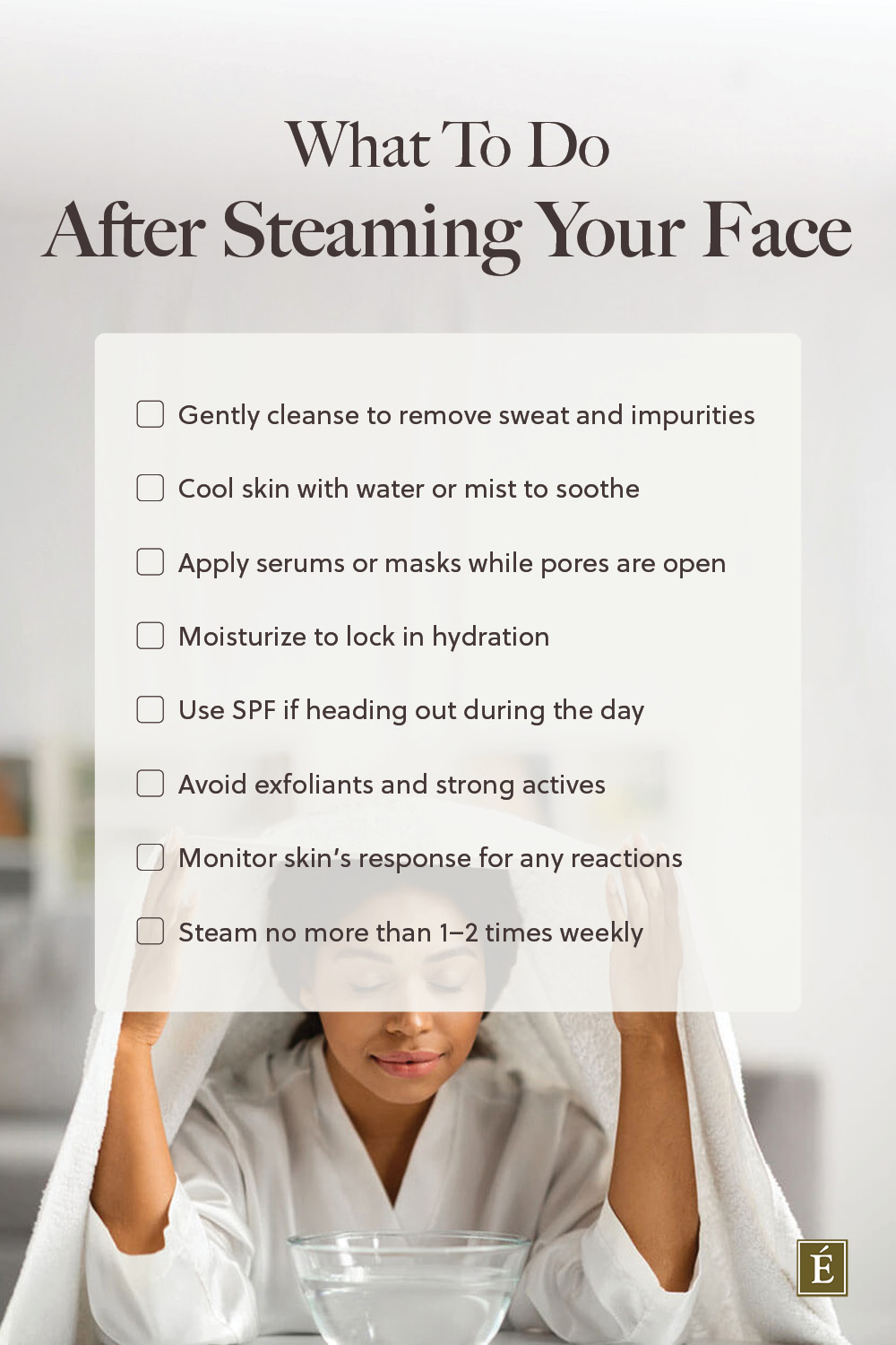 Always follow with hydration. Apply a mask, serum or moisturizer to lock in moisture and maximize results. Sunscreen is essential if you steam during the day.